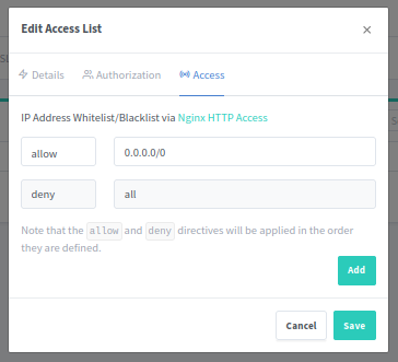 Authentication with NPM is pretty straightforward. You basically just configure an ACL, add your users, and configure the proxy host to use that ACL.