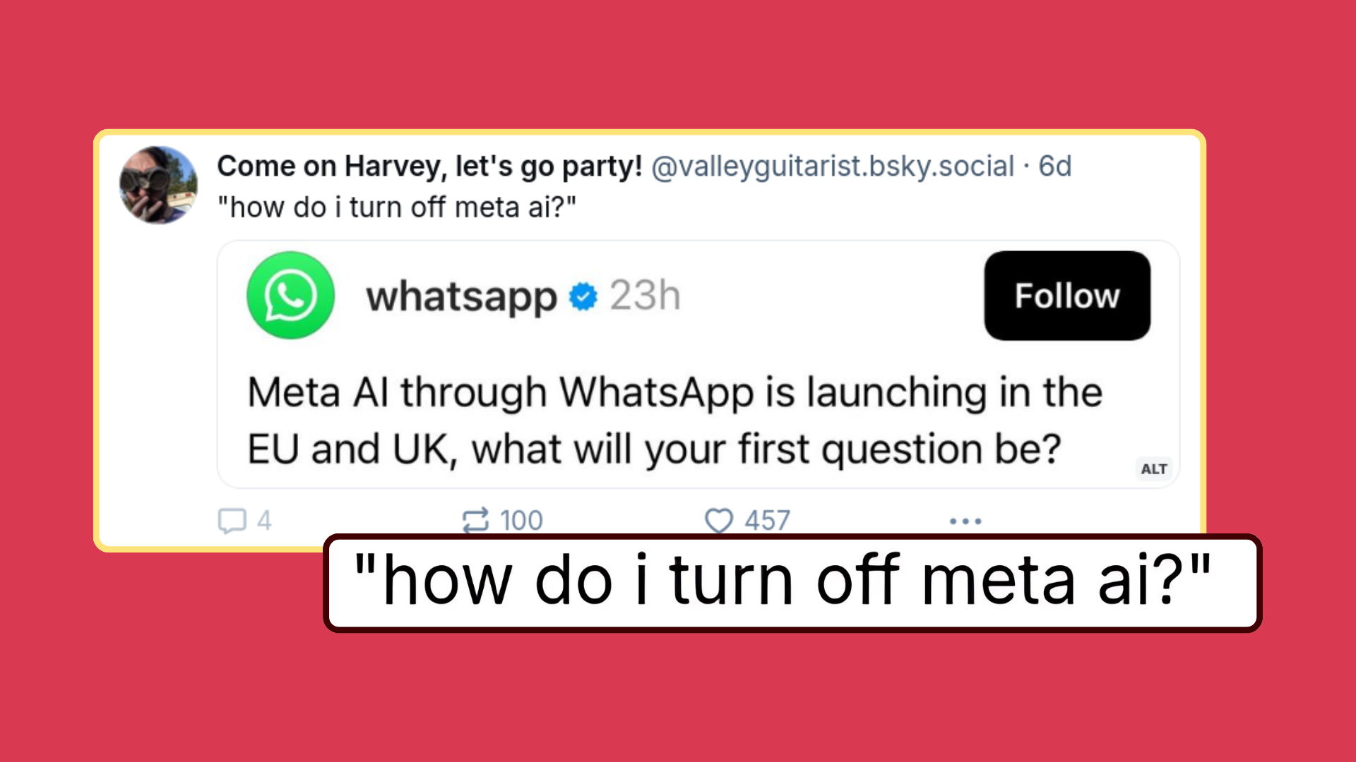arrow-up1266arrow-down1external-linkHow to turn off Meta AI in WhatsApp? You can’t, but... | Tutatuta.comBlaze@feddit.nl to Buy European@feddit.ukEnglish · 9 months agomessage-square58linkfedilink