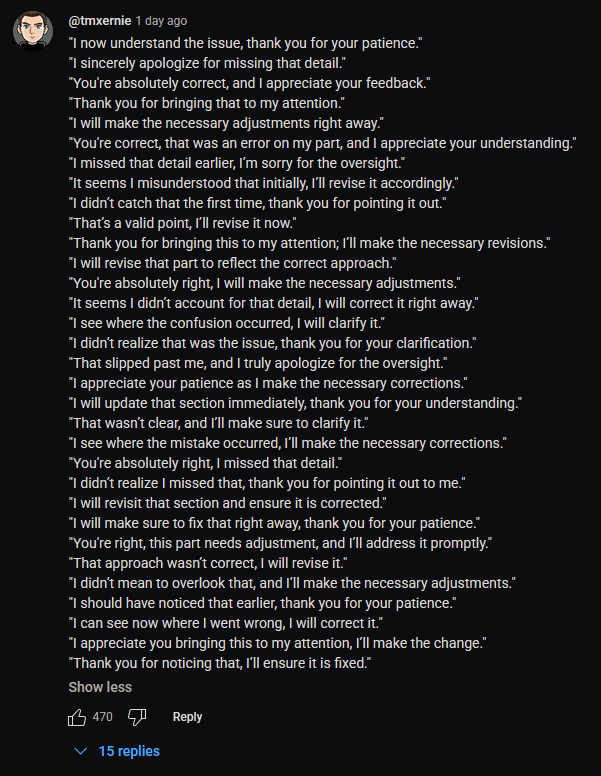 minus-squareZagorath@aussie.zonelinkfedilinkEnglisharrow-up7·10 months agoI thought it was “things a programmer says to a client (while rolling their eyes) after the client gives nonsensical feedback.”