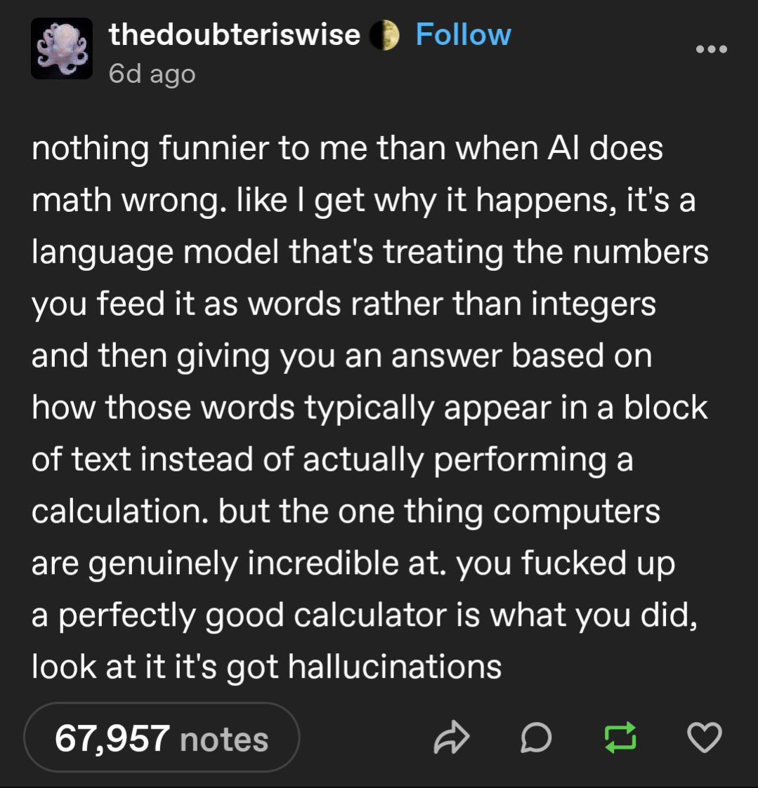 Funny. Every time someone points out how god awful AI is, someone else comes along to say “It’s just a tool, and it’s good if someone can use it properly.” But nobody who uses it treats it like “just a tool.” They think it’s a workman they can claim the credit for, as if a hammer could replace the carpenter.