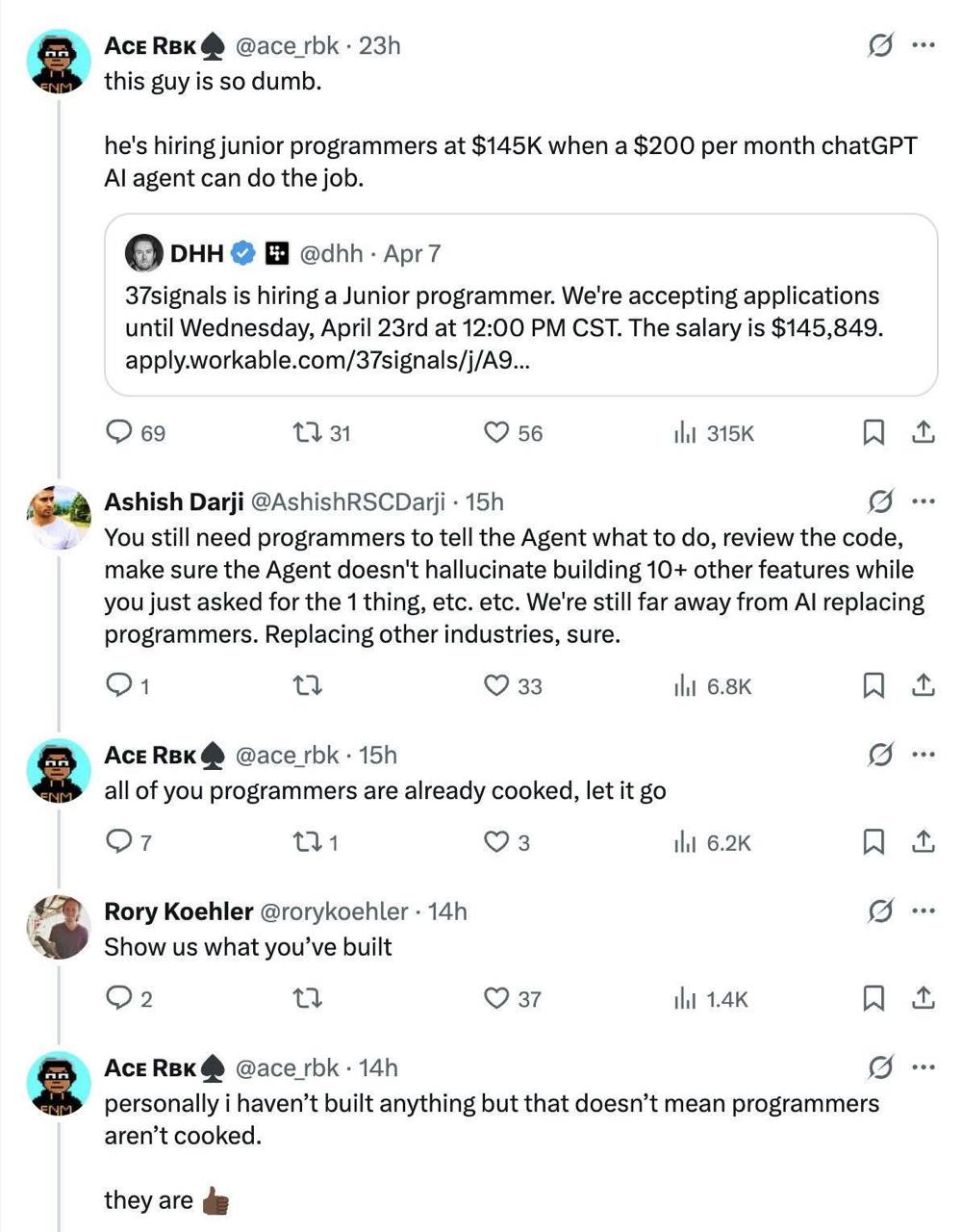 But the only way to learn debugging is to have experience coding. So if we let AI do the coding then all the entry level coding jobs go away and no one learns to debug.