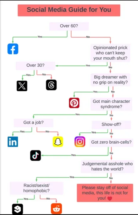 I found this funny flow chart about traditional social media. I am wondering if there is a info graphic like this but with social media of the fediverse. If this does not exist, can someone create it?