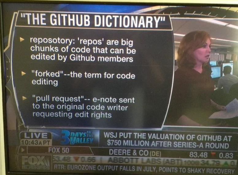 irelephant [he/him]@programming.dev to Programmer Humor@programming.devEnglish · 8 months agoFox news trying to explain github.imagemessage-square131linkfedilinkarrow-up1993arrow-down15file-text