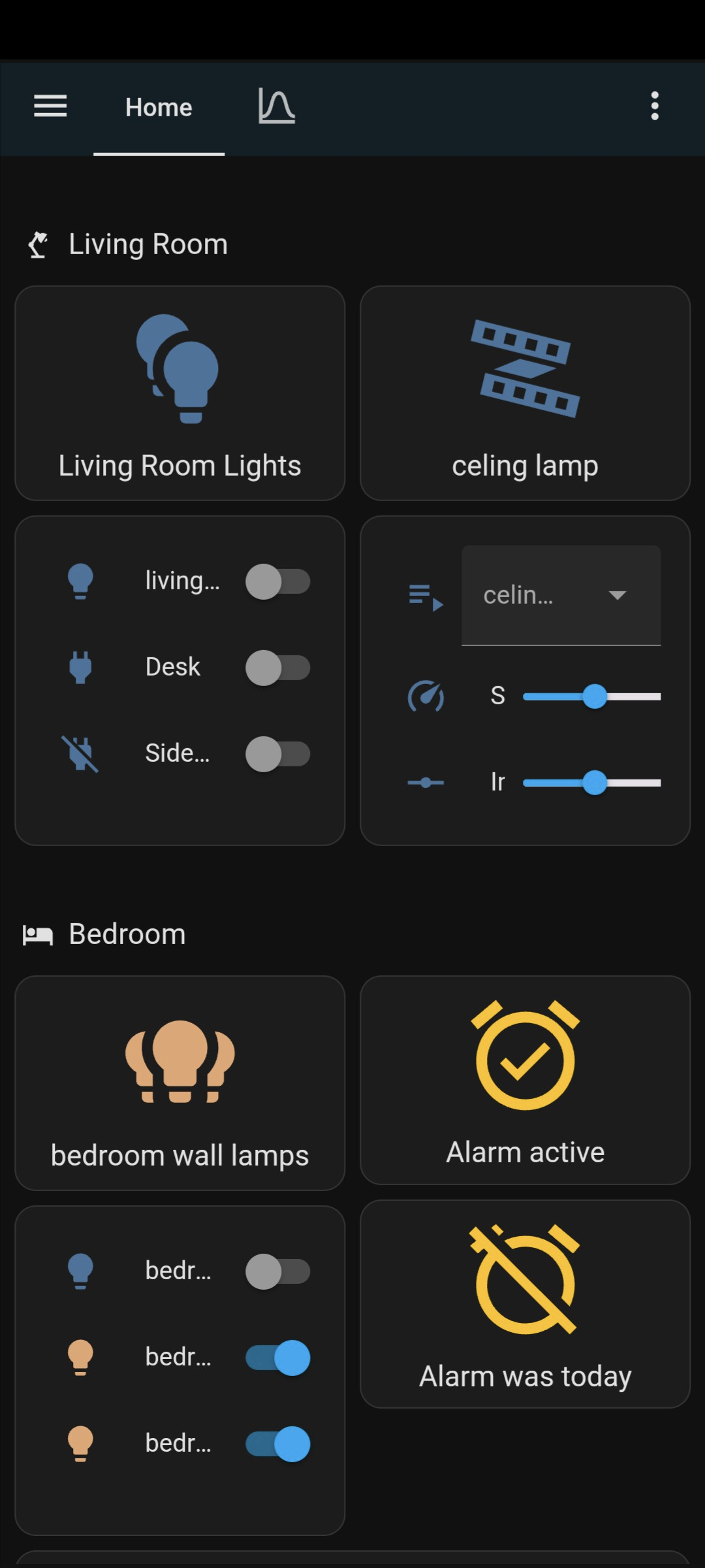 Few at-a-glance chips at the top, then buttons that drive binary helpers. Turn them on and that section of the mobile dashboard becomes visible, or tap again to put them away. Each of the chips has a function so most of my most used things are always right there.