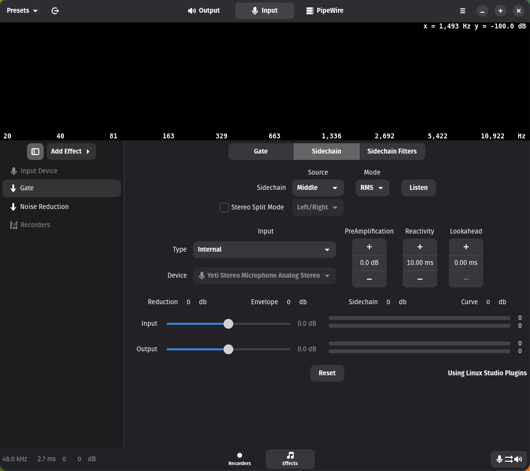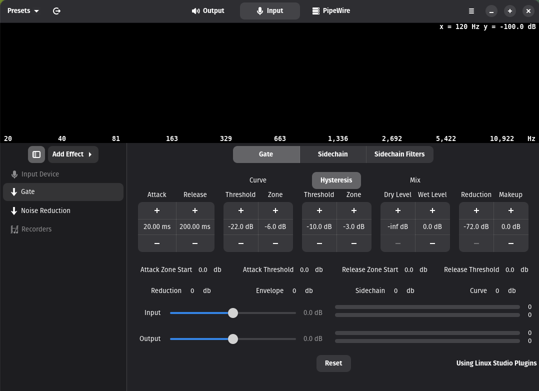 You might need to study the gate settings for a minute to tweak them to your needs, I suspect you’ll only need to change the curve threshold (-22db in my pic) to pick up your voice when you speak into it, but not background noises. You can use the db values shown in-app while speaking to help adjust it.