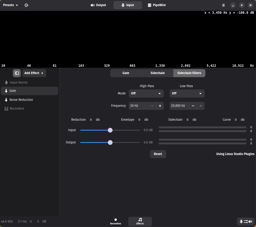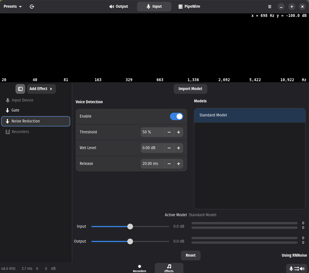 These are my app, gate and noise reduction filter settings, and the order they are enabled in for my microphone input. I am using the easyeffects flatpak which seems to include the standard noise reduction ML model.