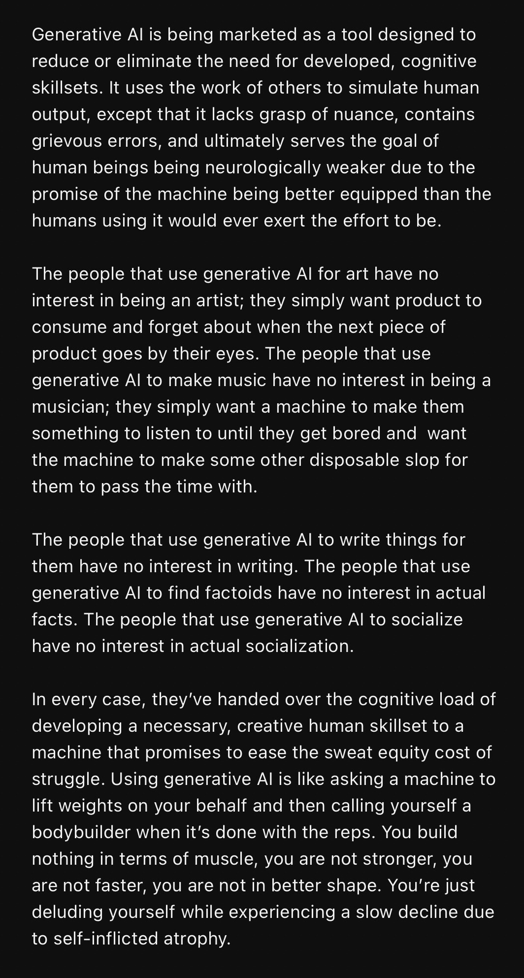 Text reads: Generative Al is being marketed as a tool designed to reduce or eliminate the need for developed, cognitive skillsets. It uses the work of others to simulate human output, except that it lacks grasp of nuance, contains grievous errors, and ultimately serves the goal of human beings being neurologically weaker due to the promise of the machine being better equipped than the humans using it would ever exert the effort to be. The people that use generative Al for art have no interest in being an artist; they simply want product to consume and forget about when the next piece of product goes by their eyes. The people that use generative Al to make music have no interest in being a musician; they simply want a machine to make them something to listen to until they get bored and want the machine to make some other disposable slop for them to pass the time with.
