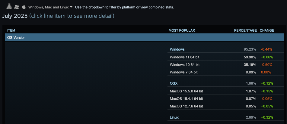 People using Linux computers at home, including for gaming, is a super tiny “community”. Also not close to double Mac, and even if it was - Mac isn’t a real gaming platform, so the fact that it’s not even double Mac is evidence of how little people care about linux for gaming.