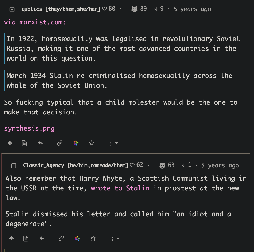 While looking I found this one on hexbear 5 years ago, almost 90 upvotes shitting on stalin for criminalizing homosexuality, and quoting him calling someone degenerate. I read this as extremely critical of Stalin: