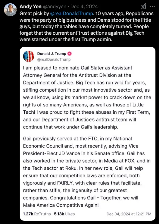 From the comments: “Andy’s statement was to recognise the choice of the Assistant Attorney General for Antitrust division at DOJ. This is someone who has history of going after tech monopolies and allowing room for the little guys (startups) to have a fair chance to grow and innovate. This was not a political endorsement.”