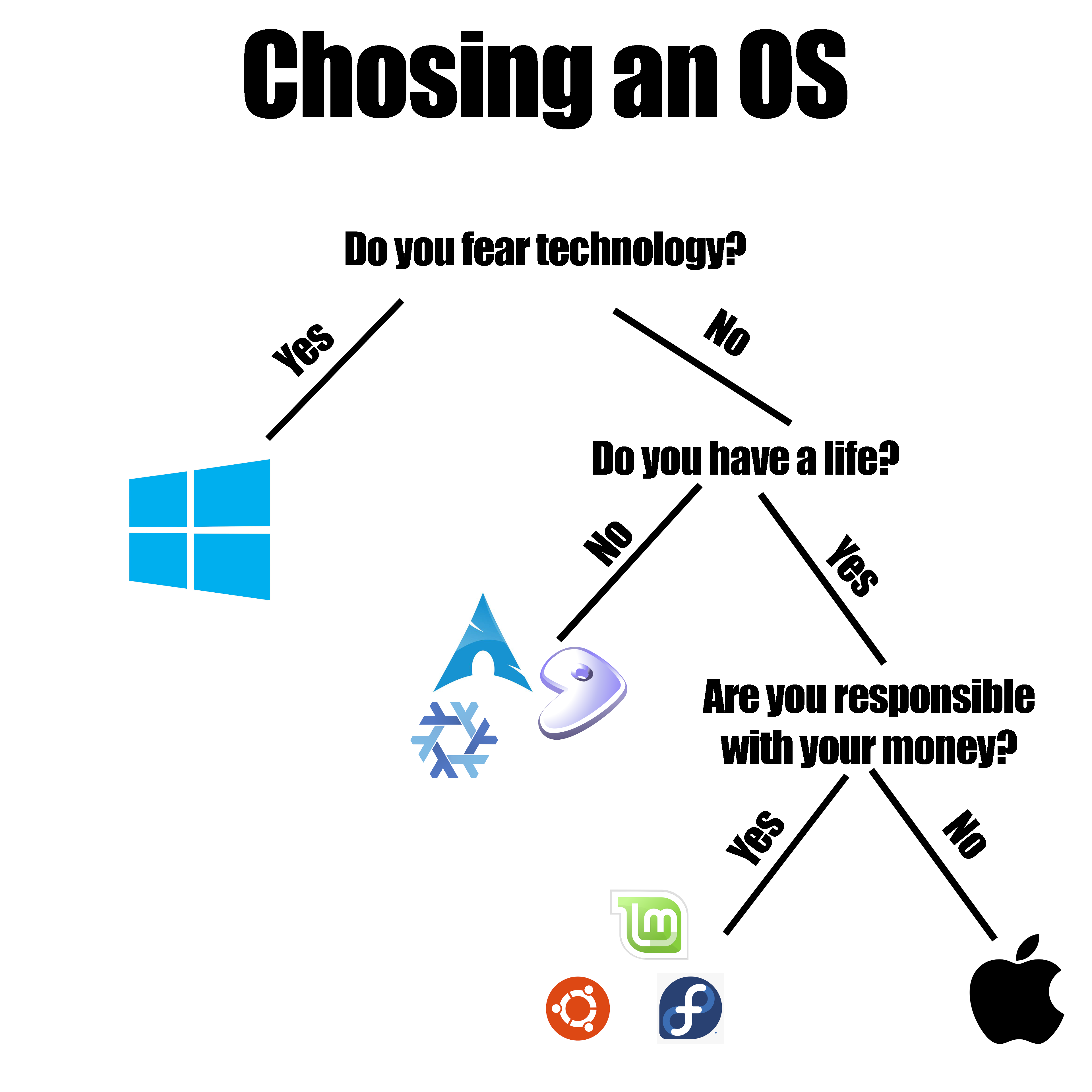 The choice tree is true, though. In high school, I used Arch Linux on my PC because I liked tinkering. Now that I’m in college, I’m using Fedora because I need something stable and don’t have time to mess with it.