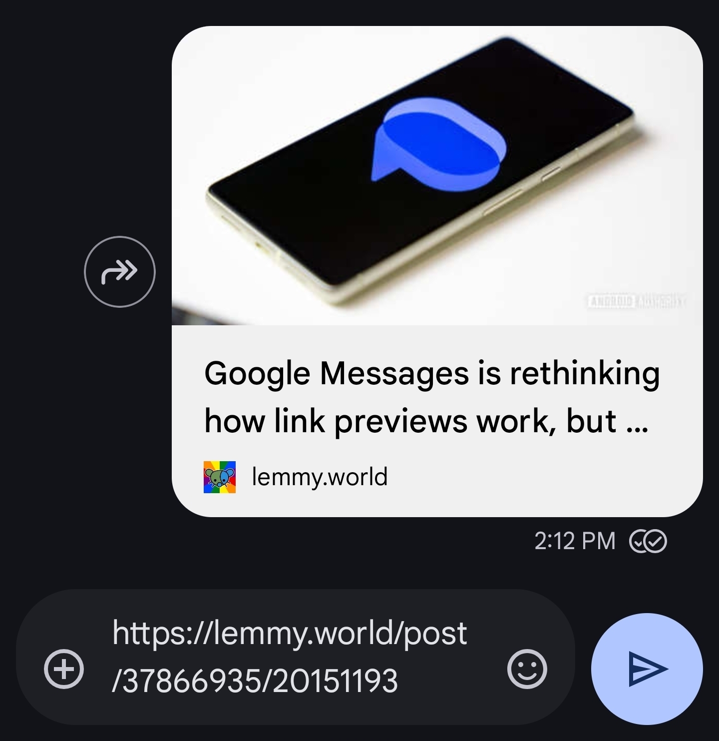 arrow-up147arrow-down1external-linkGoogle Messages is rethinking how link previews work, but we're not sure it's for the bestwww.androidauthority.comreturn2ozma@lemmy.world to Technology@lemmy.worldEnglish · 5 months agomessage-square10linkfedilinkcross-posted to: [email protected]