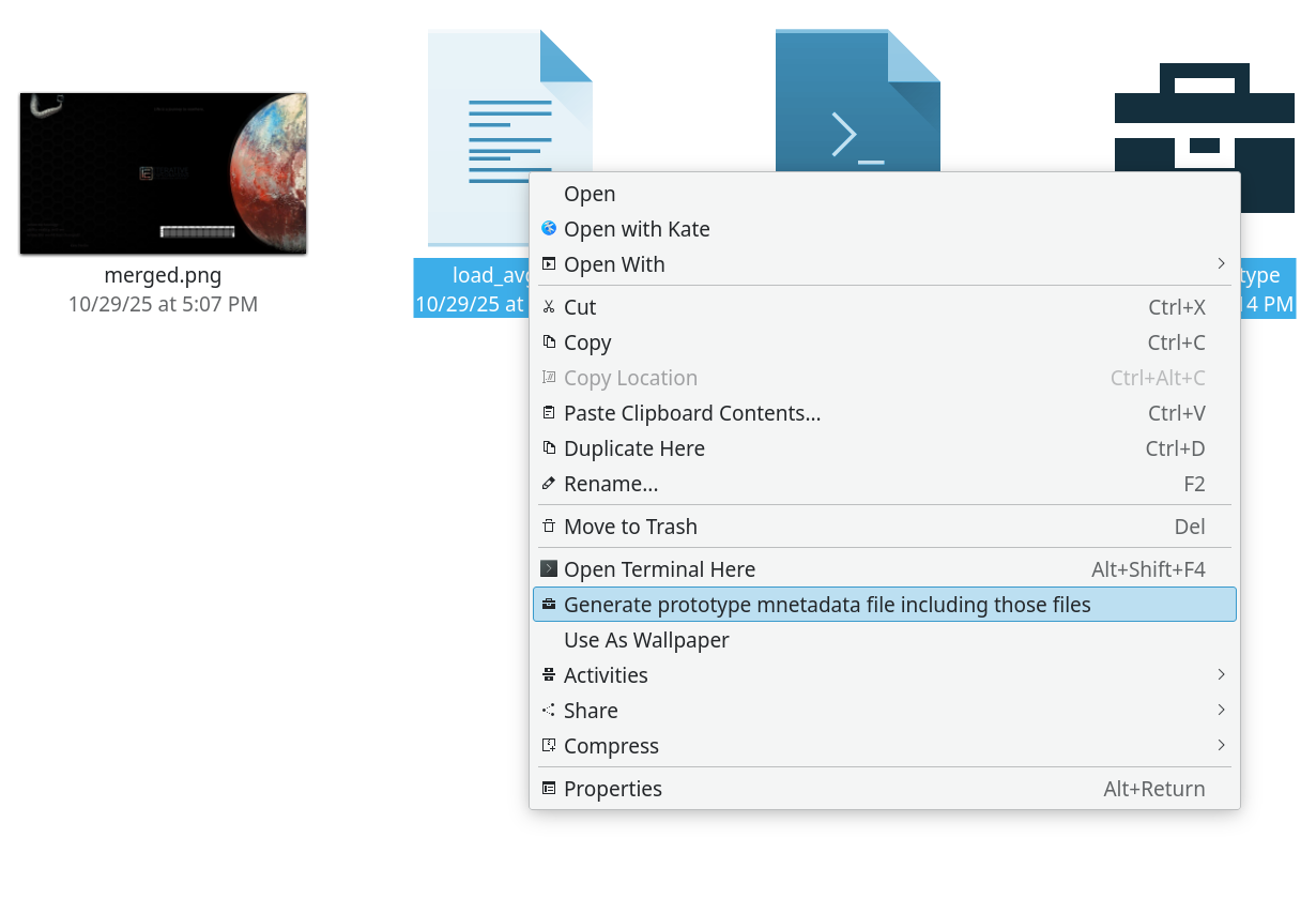 So in my use case I made a template for prototype metadata, add a menu action could be to generate the file instead of creating from the template via Exec= field. This would prepopulate the metadatafile with e.g. the list of selected files thanks to %F.