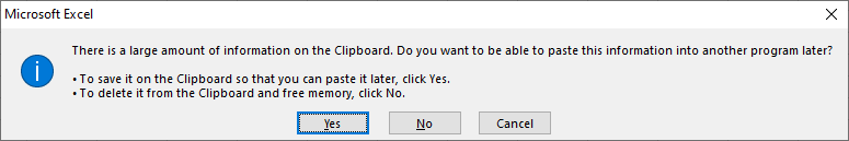 Bitch, my computer has 128 gigabytes of RAM. It’s a tiny god. The fact that I have as many as 100 cells copied to the clipboard (which is the threshold that triggers this stupid message, if you’ve ever wondered) is not even a rounding error. I’m sure this was marginally important in 1982 or whenever this was first coded into Excel, but today my computer could lose an entire megabyte of memory or maybe even ten down between the couch cushions and neither of us would notice.