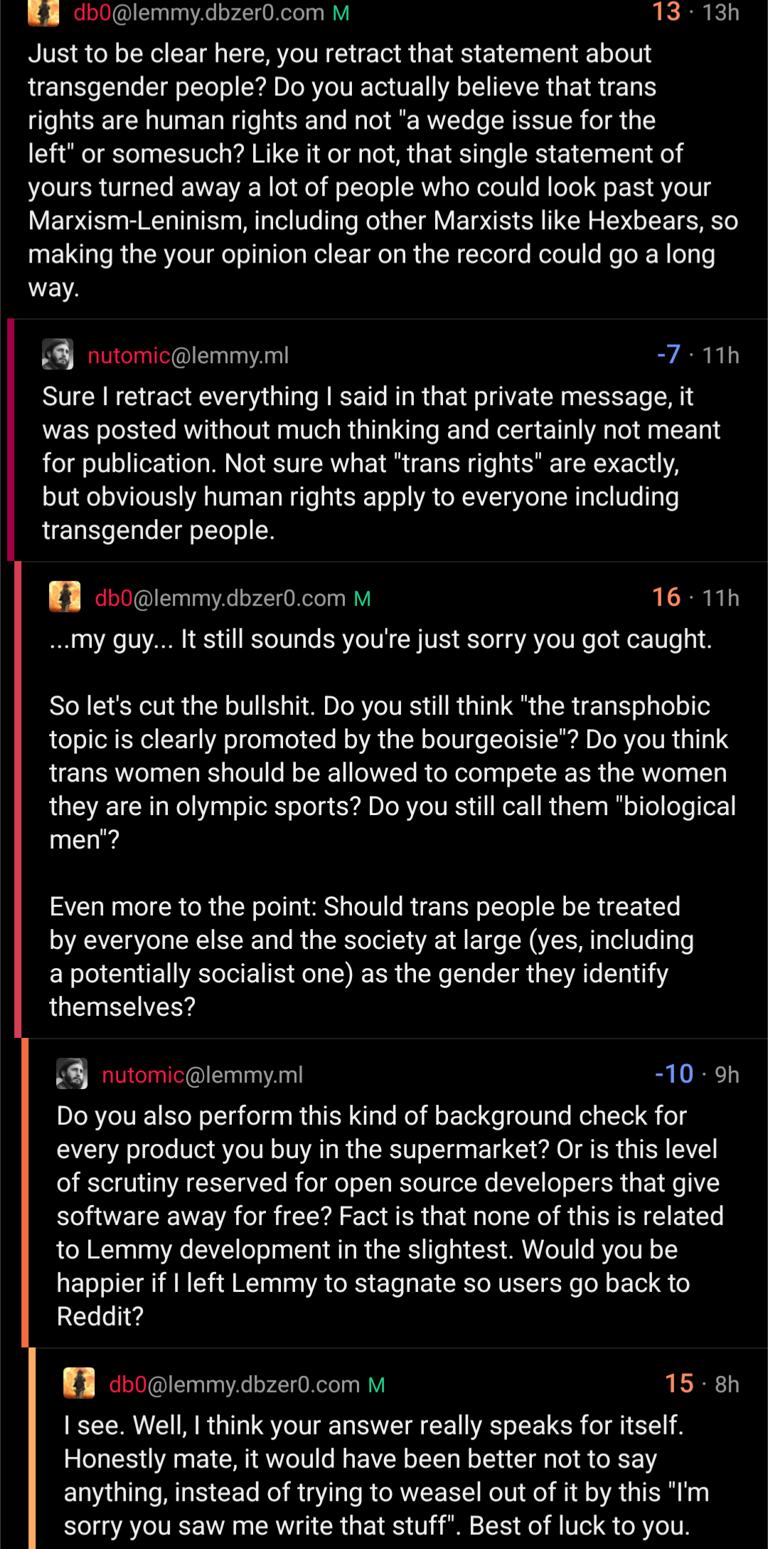 Yeah. I’m sure this gets worse, and I haven’t even spent longer than 30 seconds looking. You should probably keep the fact that you’re ‘trans’ to yourself, if Lemmy were a bigger platform you would 100% be painting the picture of the ‘mentally ill trans person’ rhetoric the conservatives are pushing. You are literally problematic in your existence.