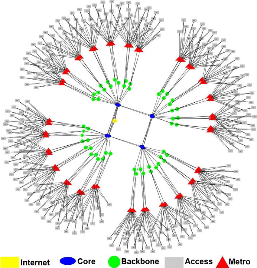 They use many different types of specialized computers and devices to connect your house (one of the grey rectangles) to the greater Internet (the yellow rectangle in the middle).