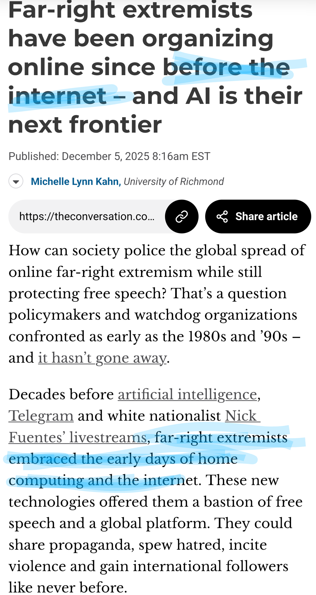 I don’t think this is right-wing specific. You could probably draw similar conclusions coming from an Islamist angle. And this so-called AI is going to be next “frontier” is not all that clear to me yet. It’s a nebulous threat at this stage that starts with a lot of “imagine if” arguments. We don’t know yet. It’s worth paying attention. But we don’t know if HitLLMer chatbots are going to cause more damage than the concentration camp simulation games that preceded them.