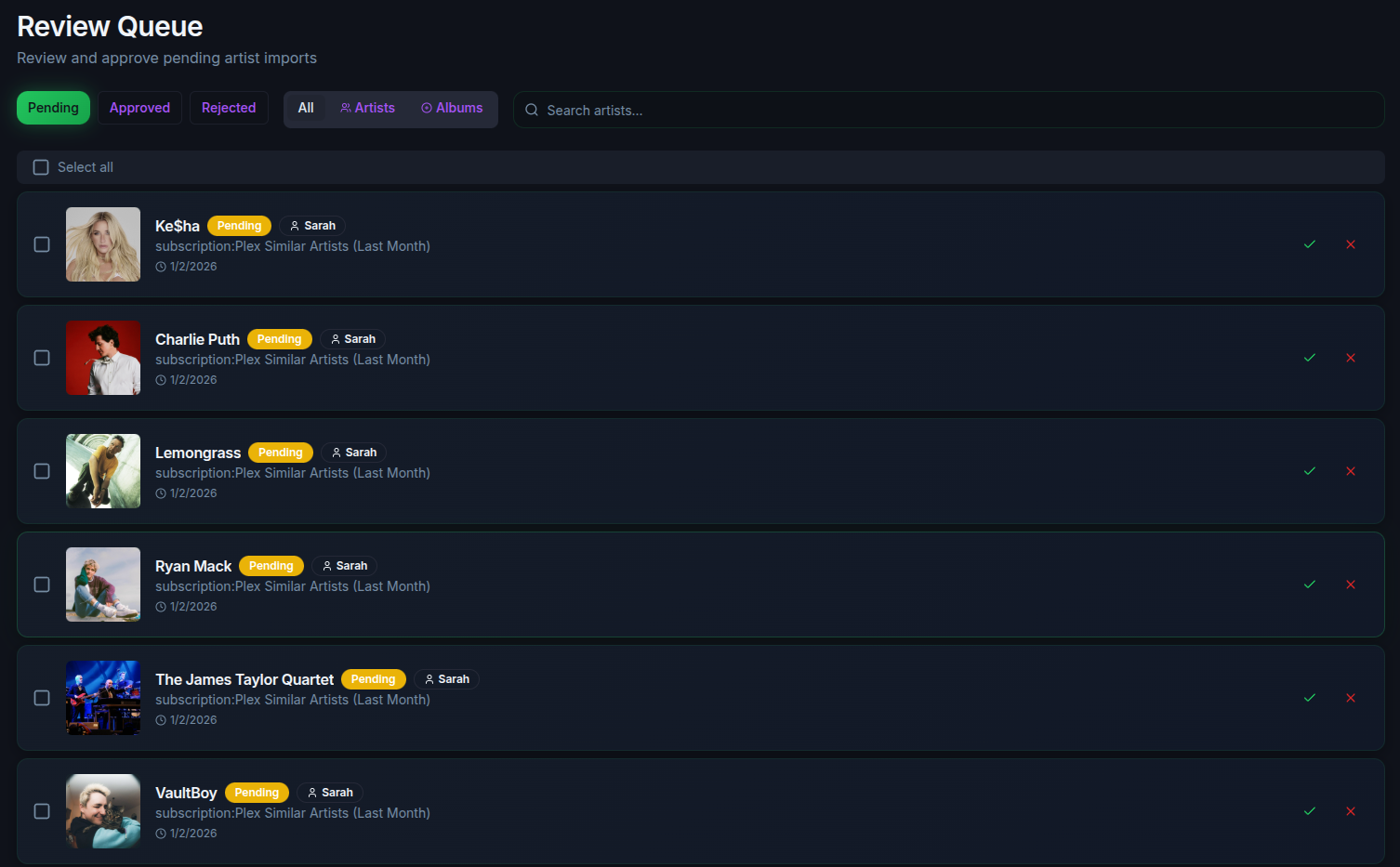 - Automatically adds approved artists to Lidarr with the profile you choose
