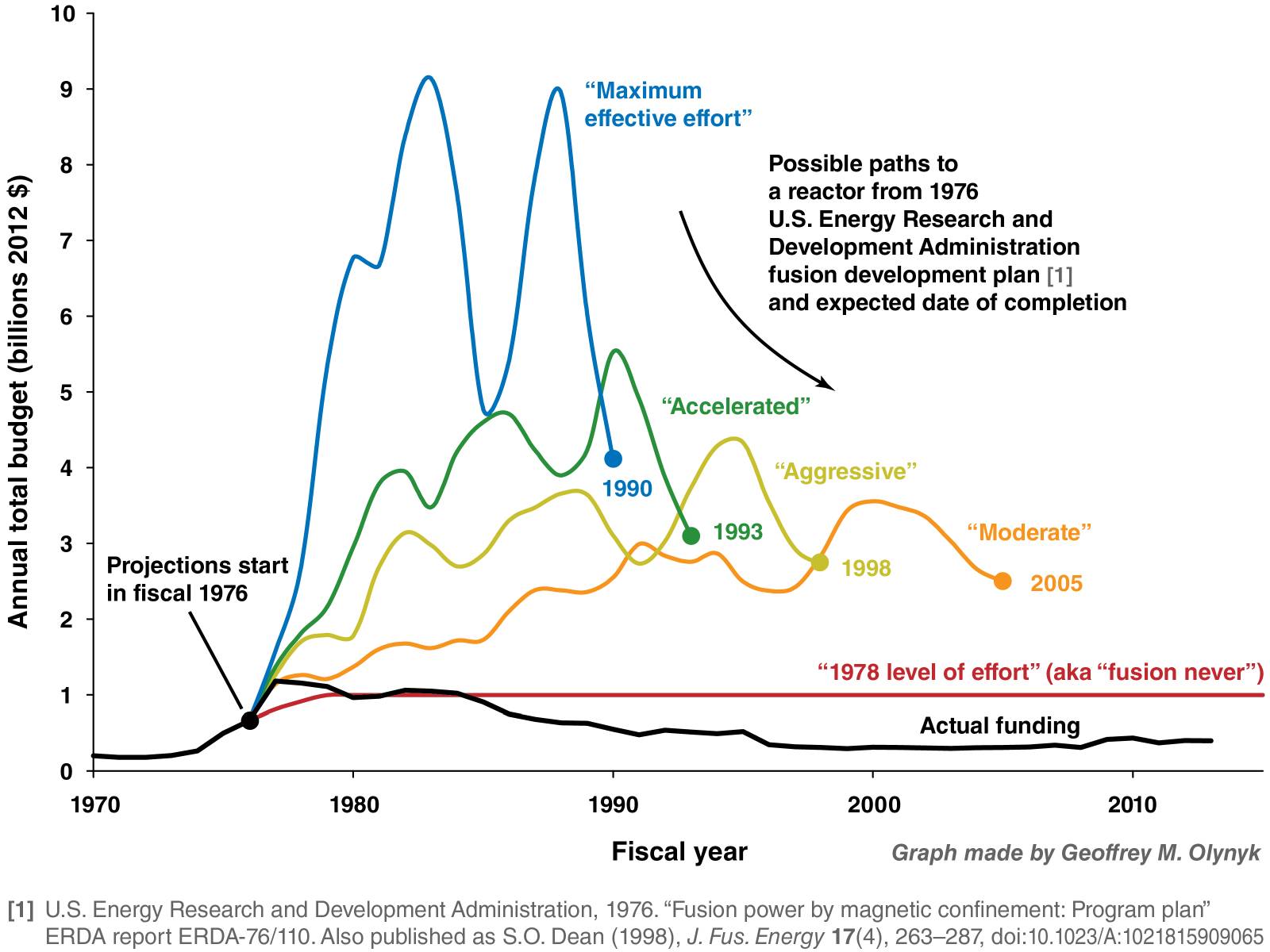 The graph is showing DOE experts in the 70s’ best guess at when we could have had a successful reactor project with various levels of funding. You’ll notice the line for ‘actual funding’ is roughly half of the estimate for ‘functionally never’ levels of funding.