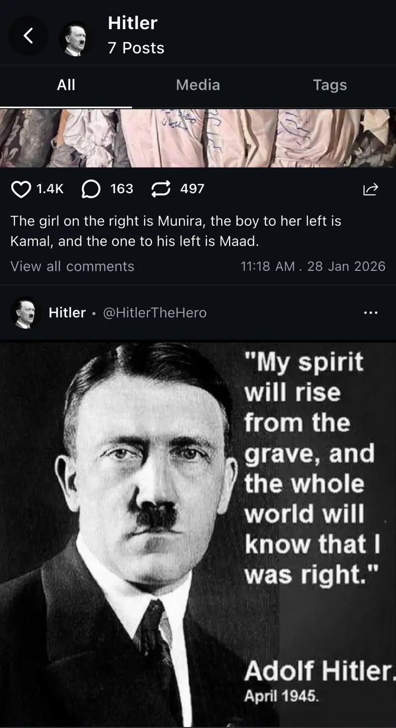 Edit 2: Looking at the account’s follower list, it looks like users are largely using the Palestinian genocide to justify Nazi imagery. Equating Israel’s actions with Jews in general. There are a few straight up Hitler glorification accounts on the follower list, which have “the Jews are genociding Palestine” types of posts right alongside 1488 posts, swastikas, and Nazi salutes. Here is a quick screenshot of some of the followers: