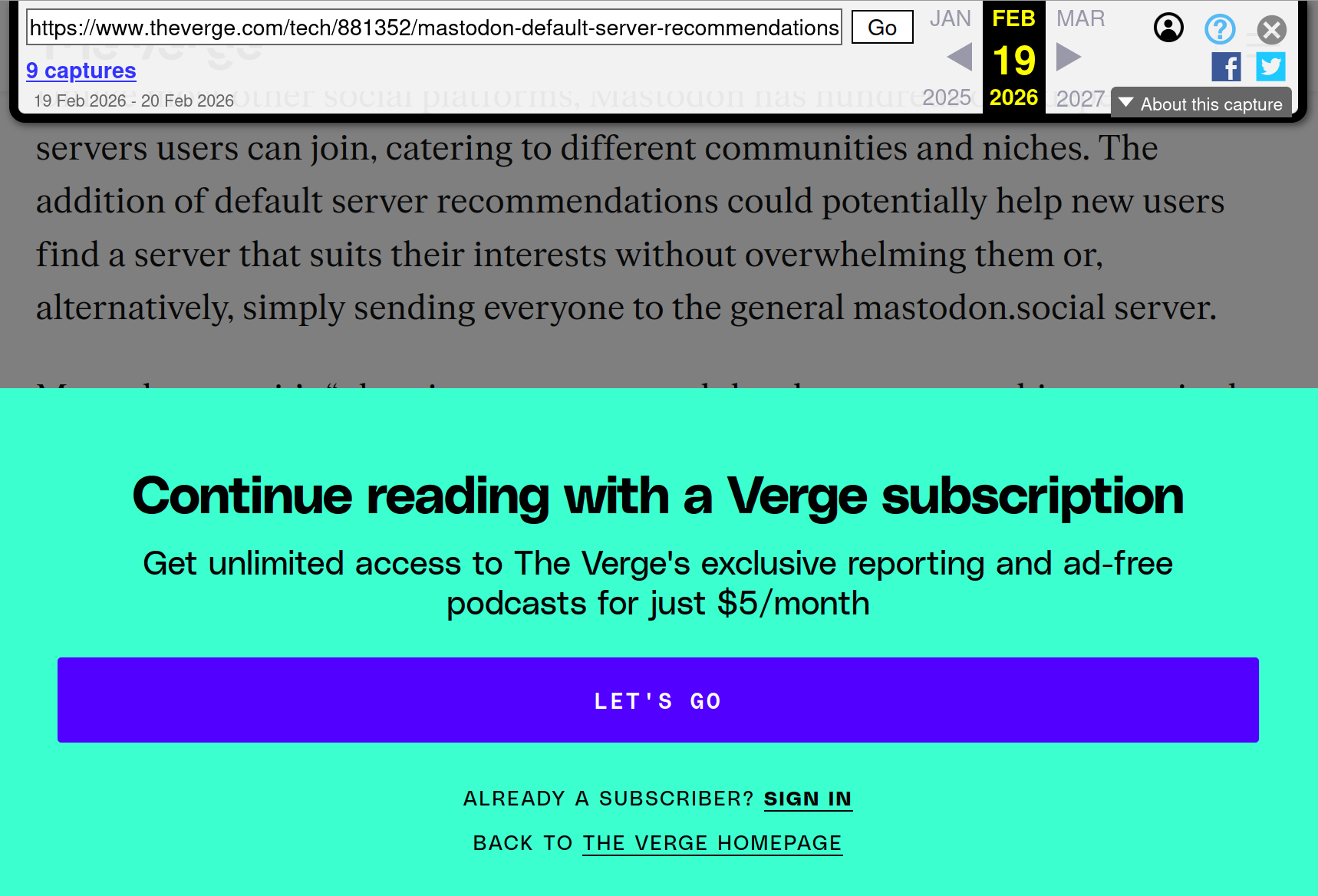 https://web.archive.org/web/20260219185525/https://www.theverge.com/tech/881352/mastodon-default-server-recommendations-experiment