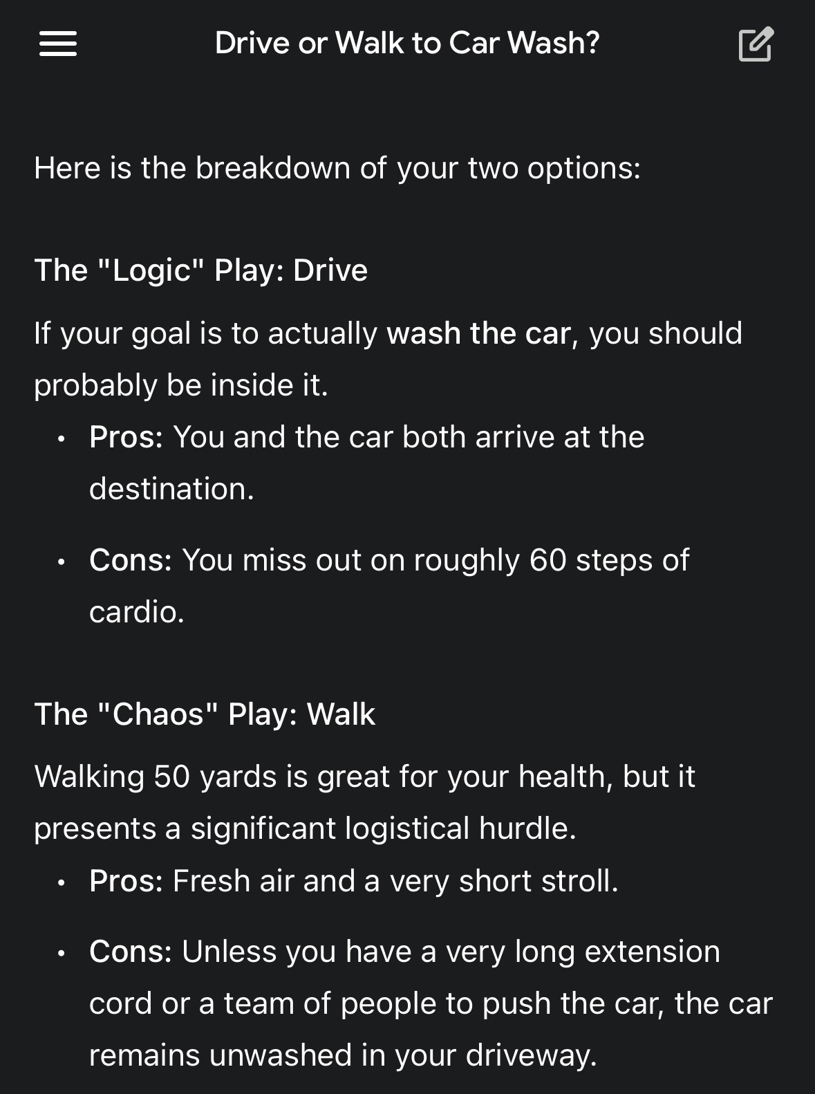 Gemini 3 pro said that this was a “great logic puzzle” and then said that if my goal is to wash the car, then I need to drive there.