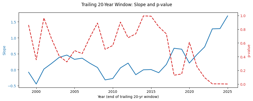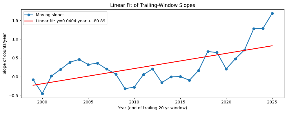 The number of fire weather days per year has been increasing, and in very recent years (the past decade) the rate of change has increased, and become statistically signficant: