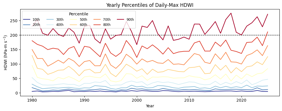 Here we’re looking at HDWI (hot dry windy index), where a “loose” definition of fire weather is if HDWI is above 200. HDWI is based on a few factors, namely, how hot it is, how dry it is, and how fast the air is moving. Hot dry air moving quickly = fire weather.