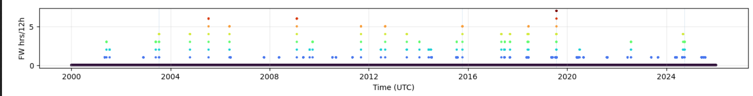 This is another way of thinking about fire risk. Here we’re going to count the amount of time, after 12 hours, that an area is in sustained fire-weather conditions. Basically, a bit of time in bad conditions isn’t the end of the world, but as you stay in fire weather conditions, fire risk increases exponentially (as plants/ fuels continue to dry out).