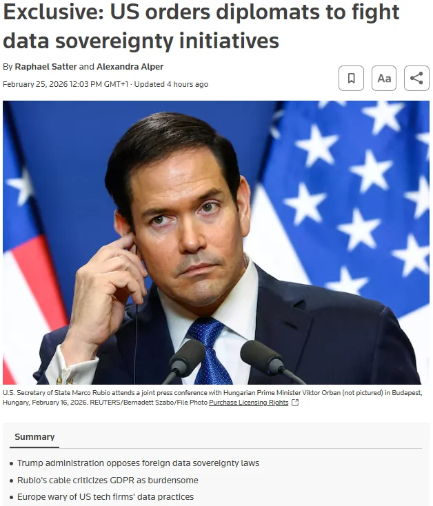 Source: https://www.reuters.com/sustainability/boards-policy-regulation/us-orders-diplomats-fight-data-sovereignty-initiatives-2026-02-25/