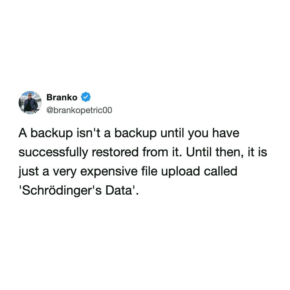 Thank you for this comment. I have backups I tested on implementation and rummaged through two years ago after a weird corruption issue, but not once since. I still get alerts about them, so I just assume they’re fine, but first thing Monday I’m gonna test them. I feel stupid for not having implemented regular checks already, but will do so now.